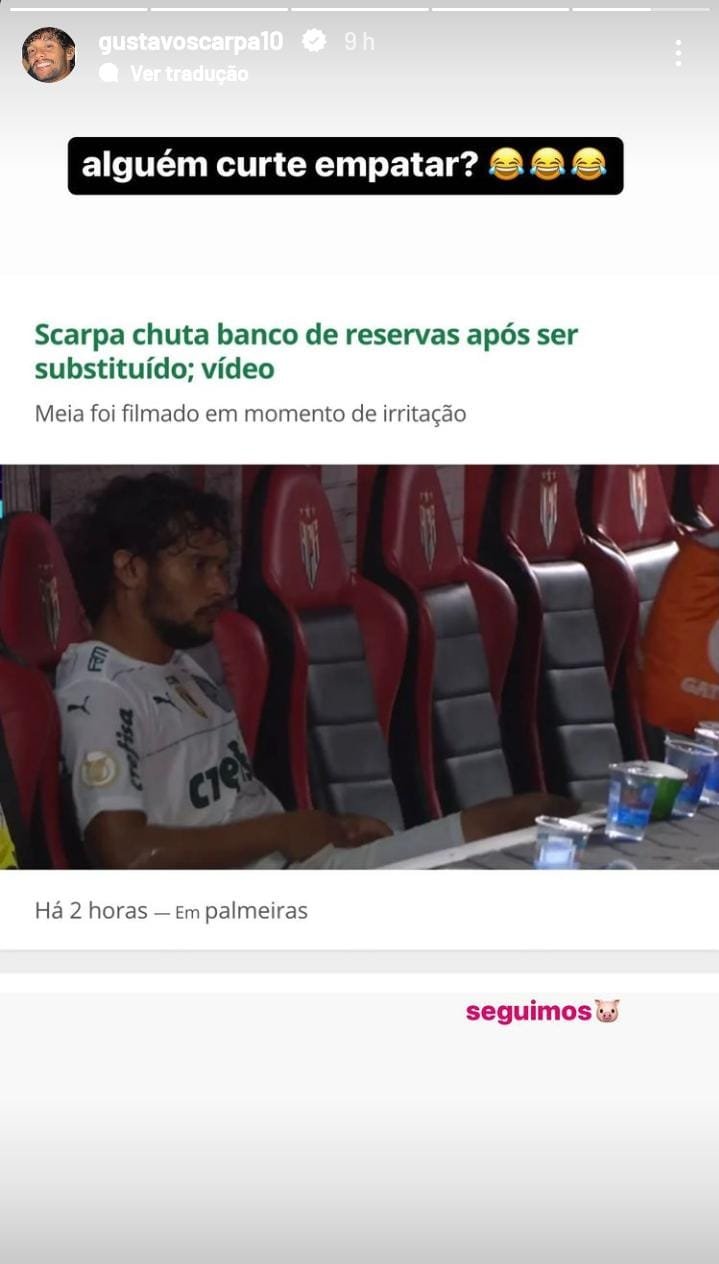 Em sua conta no Instagram, Scarpa repostou a matéria com ironia, negando que tenha algum problema interno: “Alguém curte empatar? (risos). Seguimos.” comentou o meia.